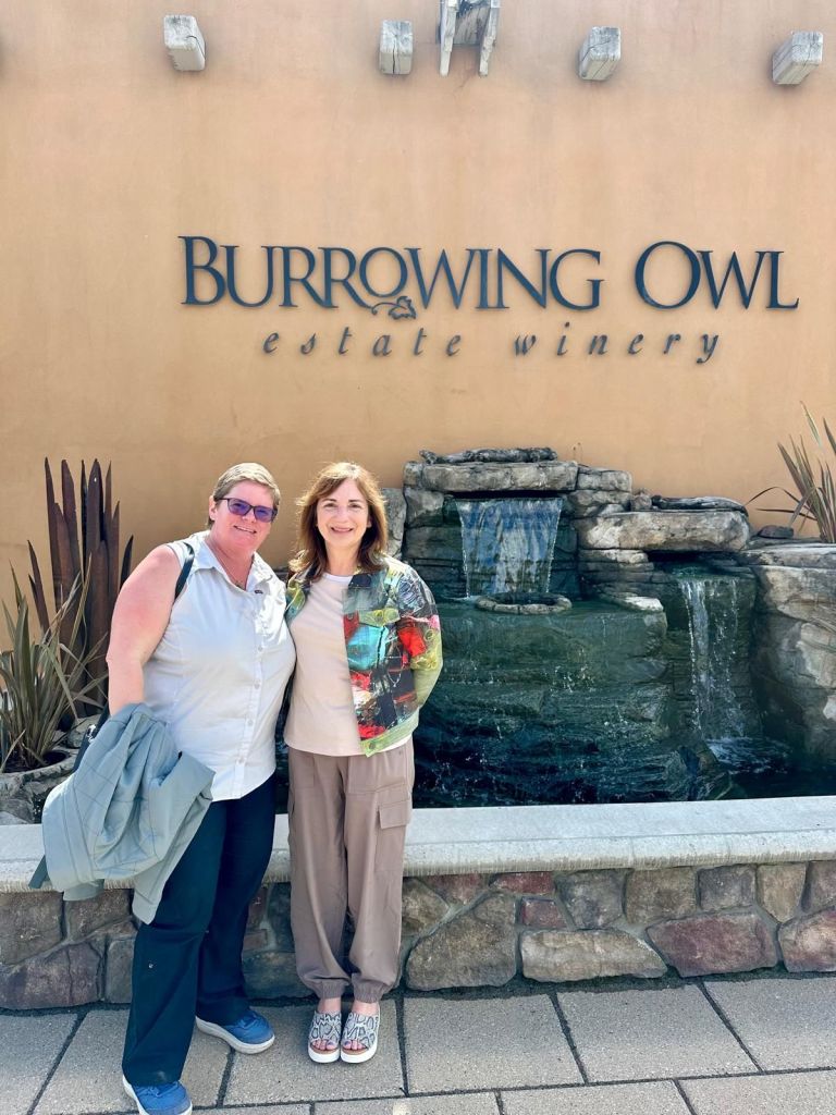 We stopped at the Burrowing Owl winery to meet Caroline’s former work colleague for lunch. The winery supports the growth of the endangered Burrowing Owls. Food, company and wine were great.